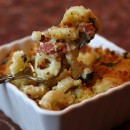 I made this with a few alterations. I used old (sharp) cheddar, and a pile of Kraft Italiano pre-grated cheese in the sauce, and then just the old cheddar on top. I used 1% milk (hahaha — trying to watch calories!!). Instead of fresh bread crumbs, I used panko crumbs. Along with the other herbs, I used onion powder and some dehydrated minced onion. And finally, I thought there was no such thing as too much garlic (in anything!) so I used three cloves instead of two with the crumbs. As it turns out, it WAS too much and overpowered the dish a bit.