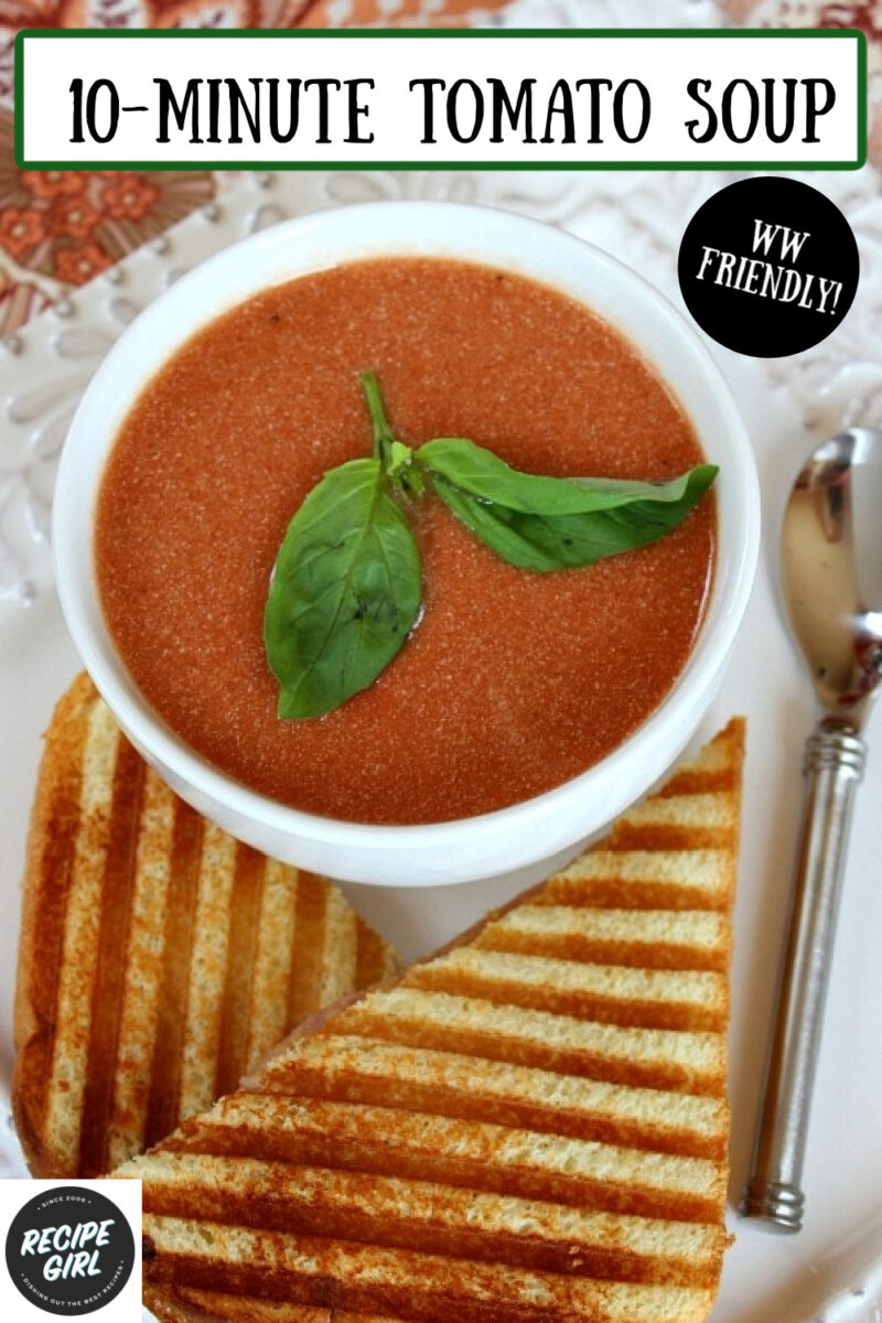 This super quick (10 minute!!) Tomato Soup comes from The Picky Palate Cookbook. It’s creamy and delicious with some basil and garlic mixed in too. It’s also kid-friendly… get the kids to help you and show them how easy it is to make Tomato Soup! And don’t you dare forget the grilled cheese!