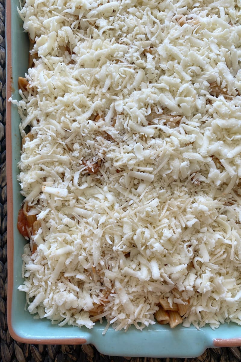 - Pour half of the sauced pasta into a deep 13x9-inch baking dish. Drop large spoonfuls of the ricotta mixture evenly over the pasta, then pour the remaining sauced pasta over the ricotta layer. Sprinkle the top of the penne evenly with the mozzarella mixture.