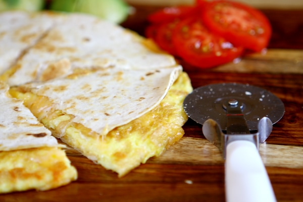 - Slide your breakfast quesadilla onto a cutting board and use a pizza cutter to cut it into wedges. Make the wedges as big as you'd like, 6 is suggested, but if you have little ones then you can make them smaller.