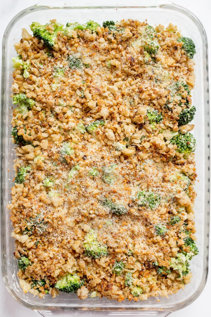- Preheat the oven to 350°F. Butter a 13x9-inch glass baking dish. In a small bowl, combine the whipping cream, remaining 2 tablespoons Dijon mustard, and 1/4 cup cheese. Place the cooked broccoli in a large bowl, and add the cream mixture; toss to coat evenly. Arrange the broccoli in the prepared dish. Sprinkle the breadcrumb streusel over the broccoli. Bake until the broccoli is heated through and the streusel is browned, about 30 minutes.
