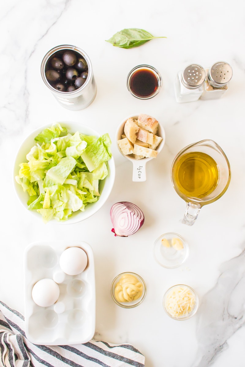 - In a large bowl, combine all the lettuce, onion, olives and eggs. Add about ½ cup of the balsamic dressing (or to taste), salt and pepper and toss to coat. Add the Parmesan cheese and croutons and toss gently.
