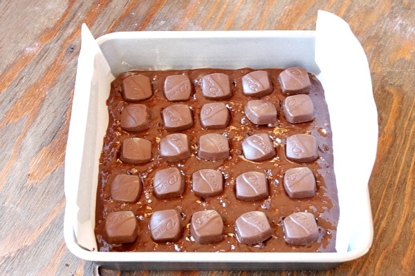 - In a large bowl, prepare your brownie batter as directed on the box. Spread ½ of the brownie batter into your prepared pan. Place the chocolate-covered caramels on top in 5 rows of 5. Spoon the remaining brownie batter on top and spread to cover.