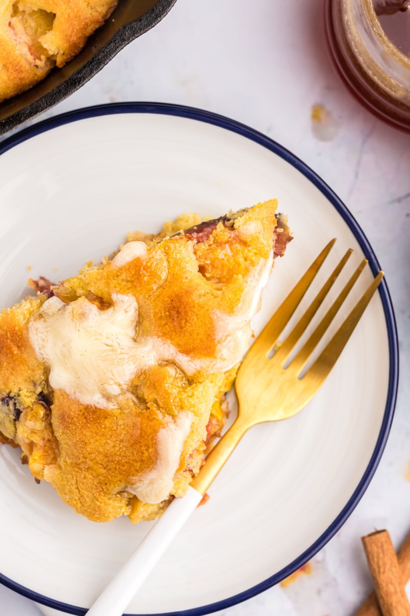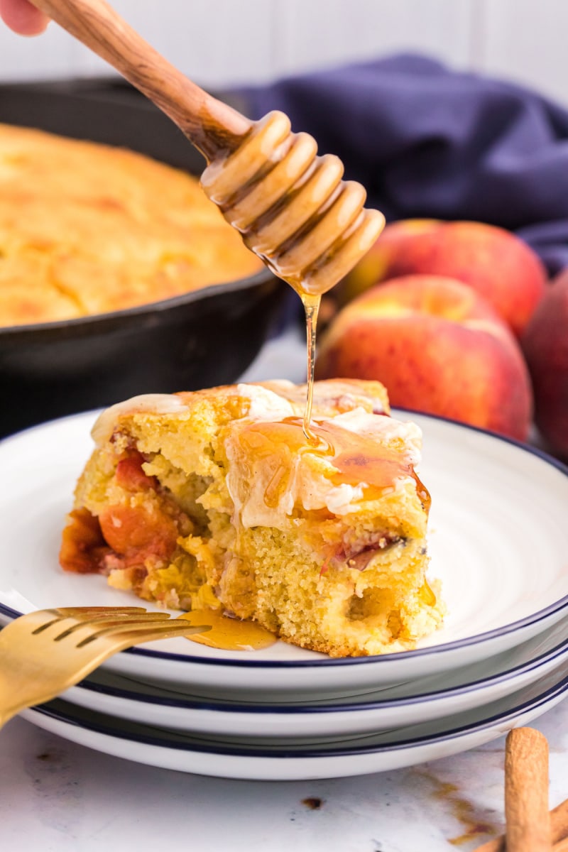 A slice of cast iron peach cornbread with honey butter makes an excellent breakfast in the summer months. You can also serve it up with some grilled pork tenderloin or even alongside fried chicken. Enjoy!