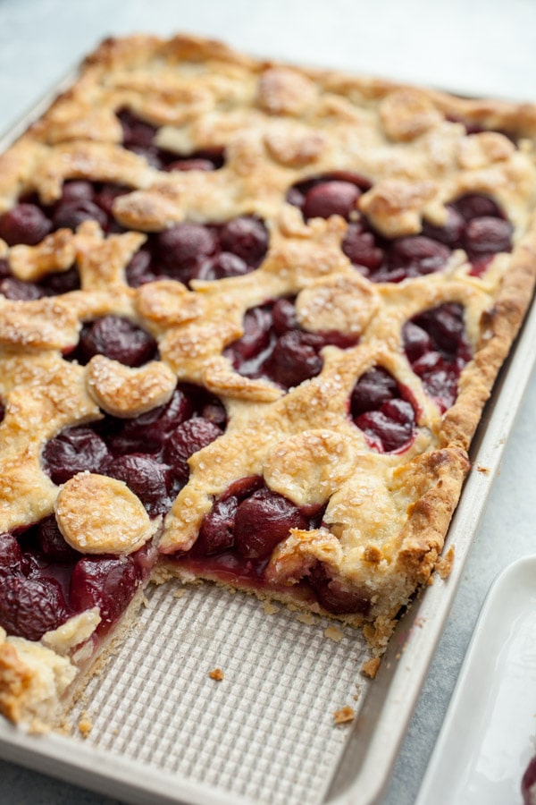 I do think you need to make your own pie crust for this Cherry Slab Pie as it requires a lot of crust! If you used store-bought, you’d probably want four crusts and you would have to reshape them since those usually come in rounds and you need rectangles for this!