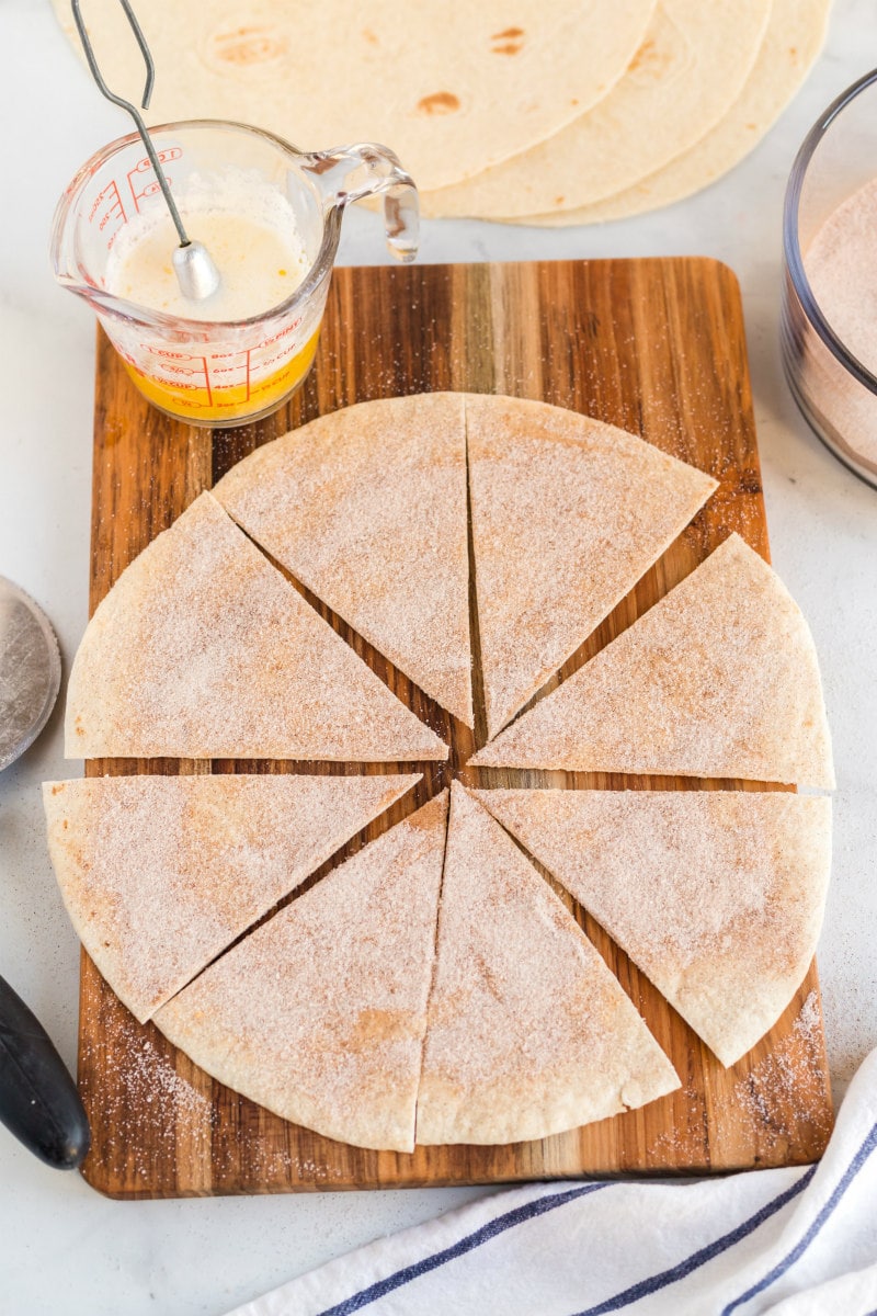 Brush melted butter on the tortillas and sprinkle sugar and cinnamon on top.