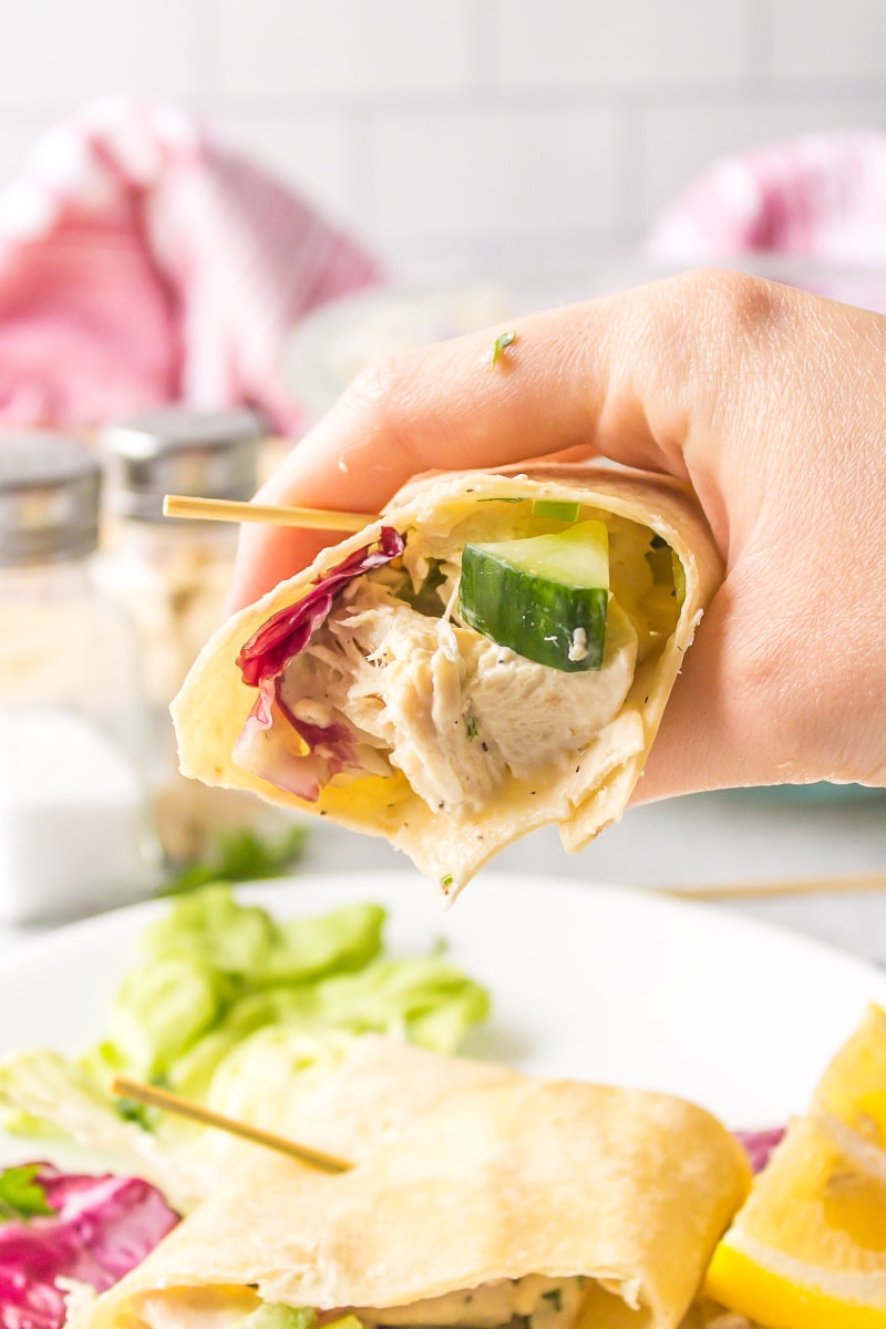 These crunchy chicken salad wraps are a recipe I make for lunch pretty often. Sometimes I skip the tortillas and just eat them in a lettuce wrap instead. I love the crunch from the cucumber and celery.