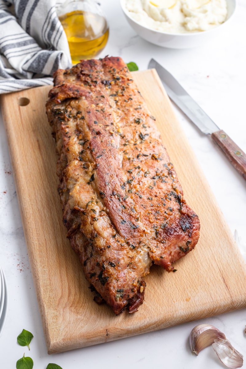 Roast the ribs in the oven for 30 minutes. Then flip and roast on the other side for another 30 minutes. Remove the ribs from the oven, and let them rest for 10 minutes before slicing.