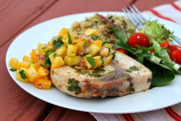 you had me sold and pienapple peach salsa, Lori! I bet it would be delicious on just about anything, including a spoon. And that swordfish… wow. Your pictures are SO perfect and capture the beauty of the whole dish!