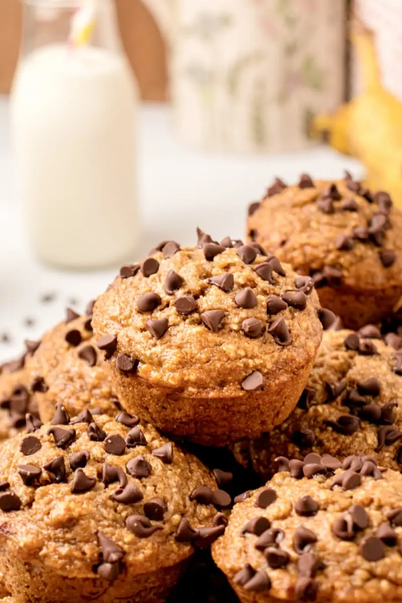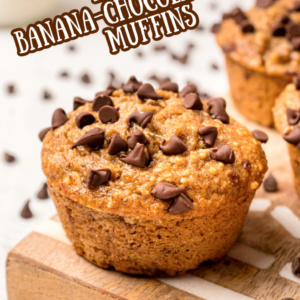 This healthier recipe for low fat banana chocolate chip muffins incorporates honey, nonfat yogurt, applesauce, egg whites and whole grain flours. Instead of chocolate chips being mixed into the batter, they are sprinkled on top. This gives you the pleasure of having a little bit of chocolate with your muffin (but not too much!)