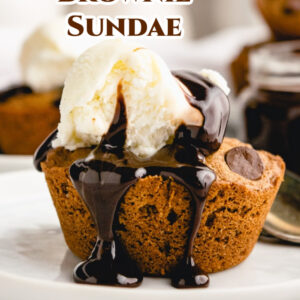 A Hot Fudge Brownie Sundae is a brownie “muffin” topped with your favorite ice cream and some delicious hot fudge.