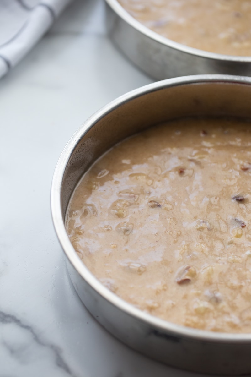 The cake batter is divided into three 8-inch round cake pans and baked.