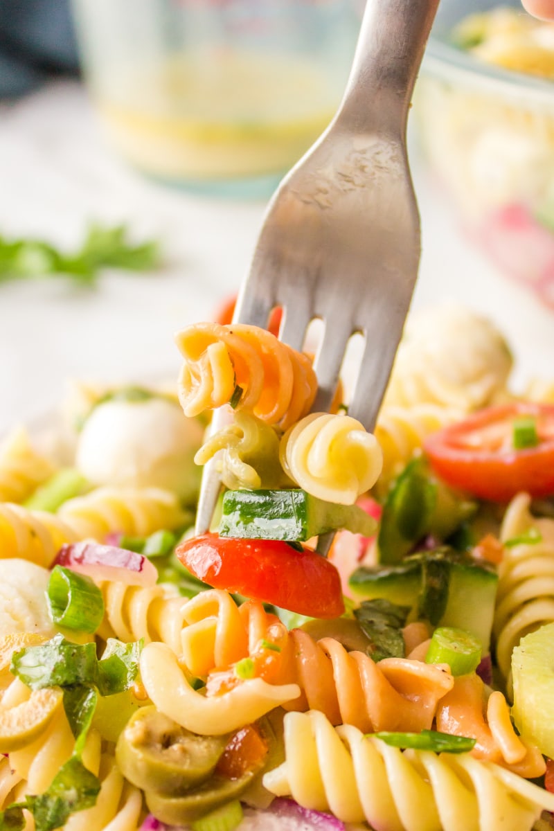 - Veggies: This pasta salad calls for using cucumber, tomato, red onion, radish, celery and green onion. All of those are great in a pasta salad, but if there is something you don’t like then it’s okay to leave it out. Also try adding diced zucchini or diced bell pepper.