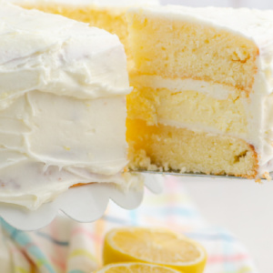 It’s best to let the lemon cheesecake cake chill for a while before serving and cutting. The more firm the cake is, the easier it will be to cut clean slices. You can even make it the night before and let it get really chilled and firm. It’ll soften up quickly at room temp. Keep it chilled when not serving. Chill leftovers too.