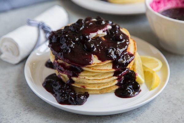 Forget plain old maple syrup. These lemon pancakes flavored with lemon zest and lemon juice deserve to be topped with something better. This quick and easy homemade blueberry sauce is simply made from fresh blueberries, lemon zest, and maple syrup. The sauce is perfect over pancakes, wonderful when stirred into oatmeal, and such a treat when poured over ice cream!