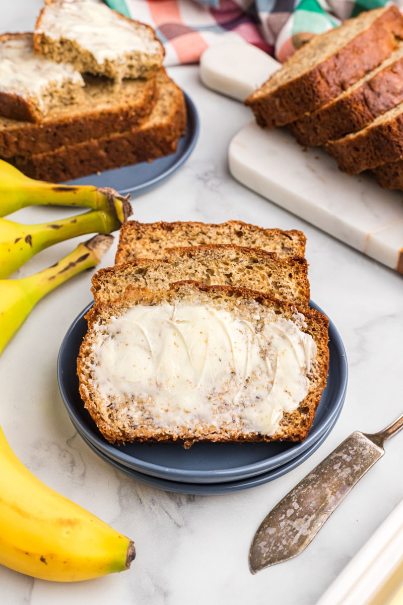 Keep the baked bread in an airtight container, and eat within a few days. Alternately, you can freeze the whole loaf of banana bread. Wrap banana bread in plastic wrap. Then wrap the loaf in aluminum foil too. And then drop the wrapped bread into a large freezer zip baggie. Freeze for up to three months. Alternately, you can wrap individual slices, wrap them in the same manner and freeze. Then it’s easy to take out one slice to enjoy when the craving strikes!