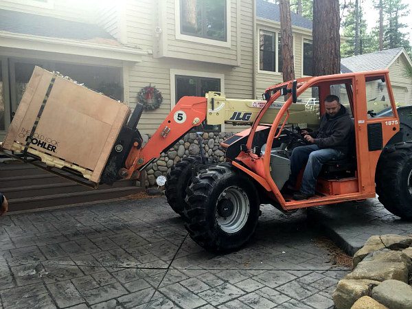 It turns out that the tub is rather heavy, and our master bathroom is on the second story.  Our contractors decided that using a forklift to get the bathtub up to our master bathroom (via the deck outside the bathroom) was going to be their best bet… since we have kind of a curvy staircase on the main entry.  They took the deck apart… motored the fork lift across our front yard, down our side yard…