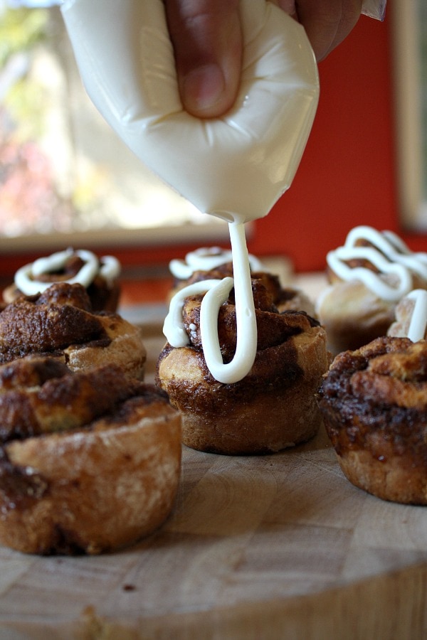 adding cream cheese frosting to No Yeast Cinnamon Rolls