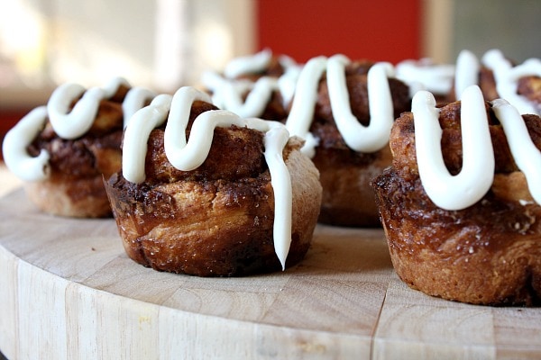 They bake up kind of muffin-like (but not muffiny in texture- they’re a bread texture instead). Note: THEY DO NOT TURN OUT LIKE SOFT CINNAMON ROLLS THAT YOU KNOW AND LOVE!  They are more crusty. Read all of the comments below the recipe. People who have tried these have been happy with the results!!