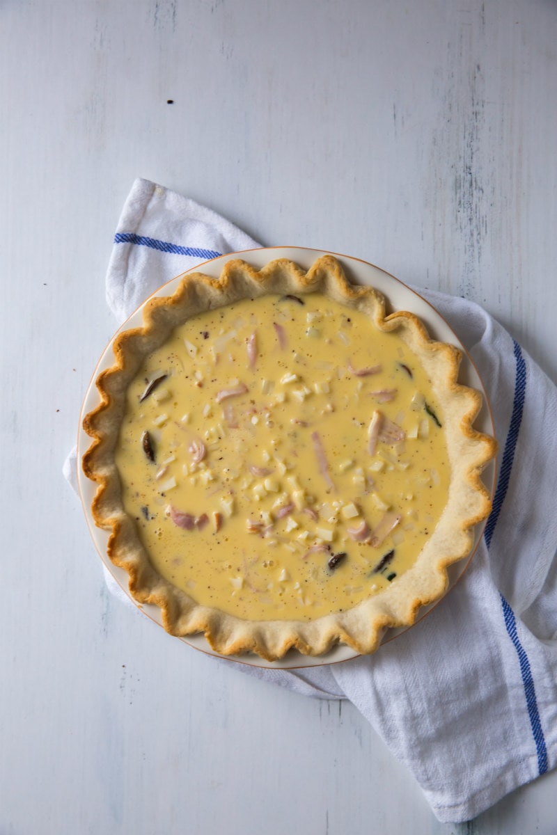 After you pre-bake the crust, you’ll layer in the veggies and other ingredients (cooked bacon, onions, mushrooms, ham and Swiss cheese). Then the egg mixture (eggs mixed with evaporated milk, garlic and spices) is poured on top. At this point, it goes into the oven and is baked for 35 minutes.