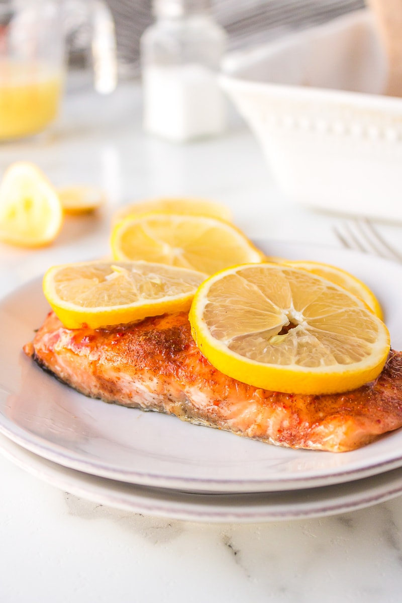 There is an incredible amount of flavor in this salmon. The fruit juices lend a delicious sweet, citrus flavor to the fish. And the combination of spices and sugar rubbed on top is so amazing too.