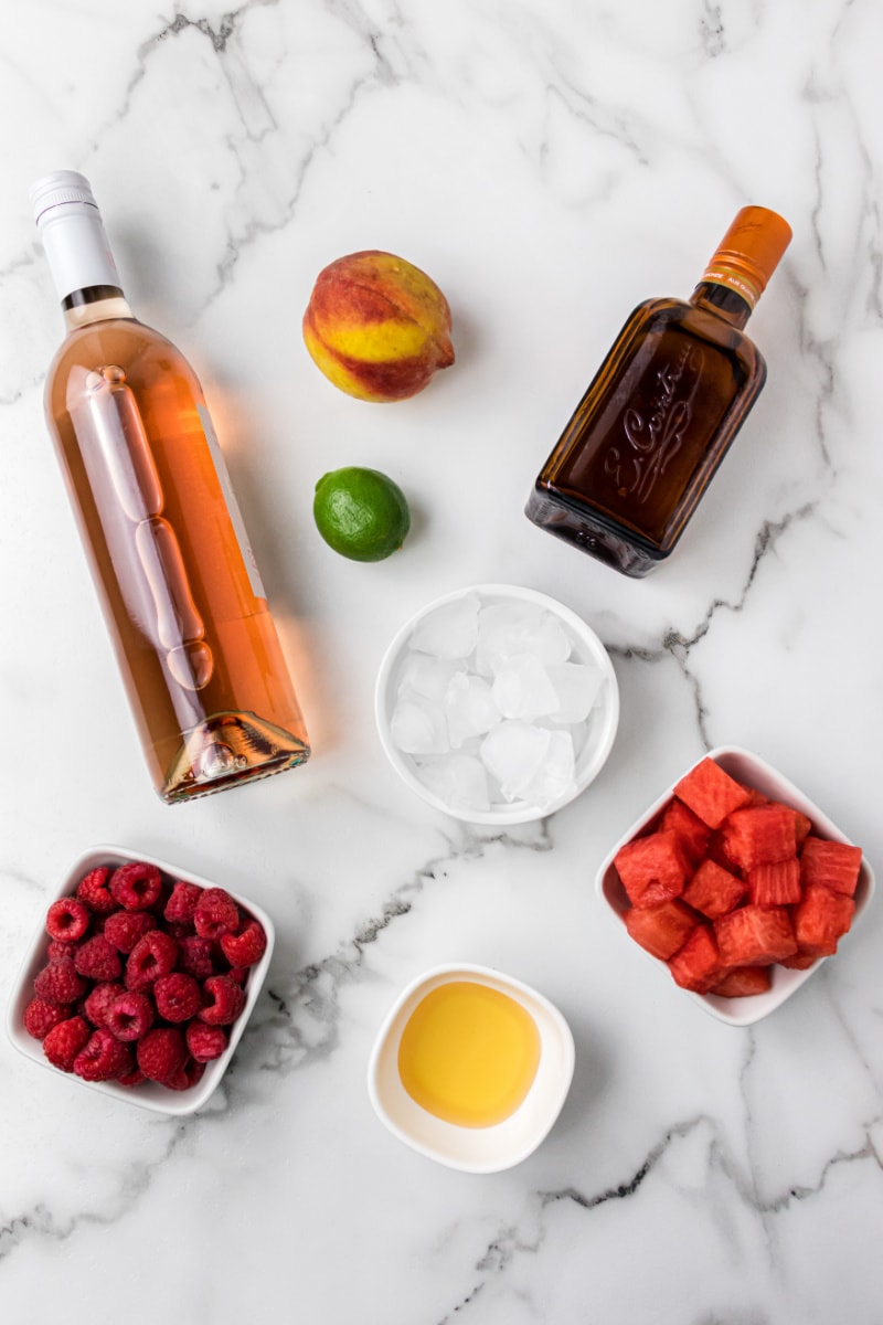 - In a large pitcher, combine the rosé, Triple Sec and desired sweetener. Add the raspberries, watermelon, peach and lime and stir gently to combine. Chill for 3 to 4 hours. Serve over ice with plenty of fruit in each glass.