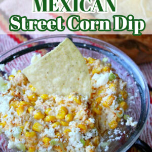 I suggest that you add some extra goodies to the top of the dip for serving: chopped green onions, crumbled Cotija cheese and a sprinkle of chili powder. Trader Joe’s also sells an Elote seasoning. That’s good to sprinkle on top too.