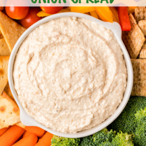 Sweet Caramelized Onion Spread is a delicious dip to display at a party with plenty of fresh vegetables.