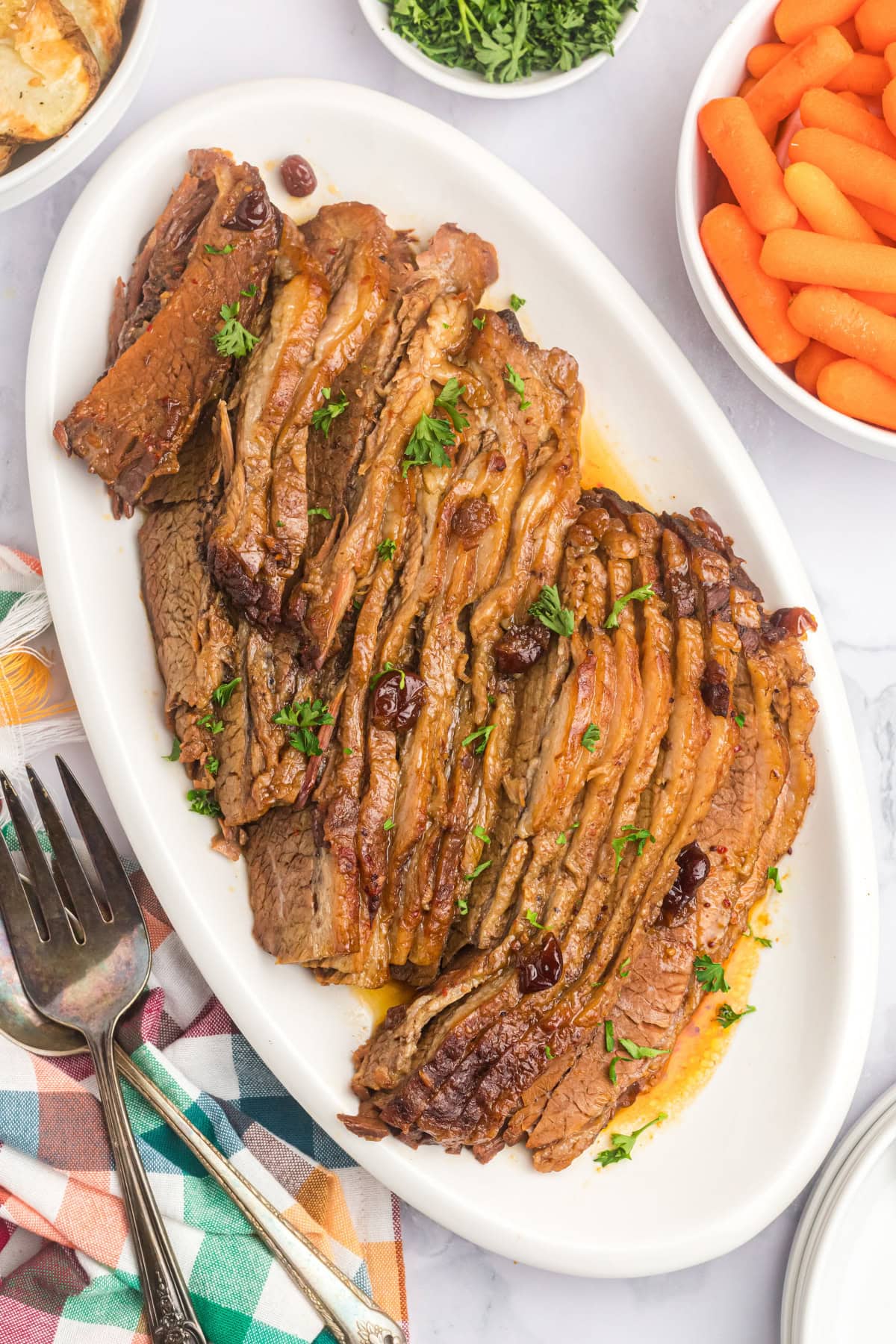 This brisket pairs beautifully with classic sides like mashed potatoes, green beans, macaroni and cheese, macaroni salad and dinner rolls.