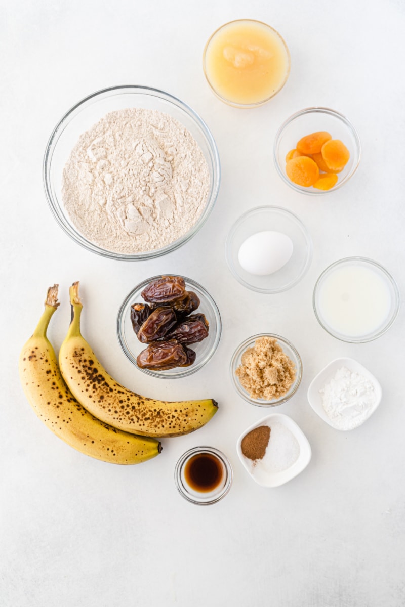 - In a separate bowl, mash the bananas, then add applesauce, egg, vanilla and milk, stirring well. Pour onto the flour mixture and stir gently just until blended (don't over-mix or it might turn out a tough bread).
