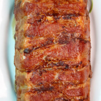 Line a loaf pan with bacon slices- on the bottom and the sides. Add the meat mixture to the pan. It will be very moist. Wrap the bacon slices up and over the meat mixture.