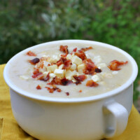 Remove half of the mixture and place into a blender or food processor. Blend until puréed and return to crockpot. Add the milk and butter. Take out a little bit of liquid and whisk the cornstarch into it. Add the cornstarch mixture to the slow cooker. Cover and cook on high for an additional hour. Sprinkle individual servings topped with bacon.